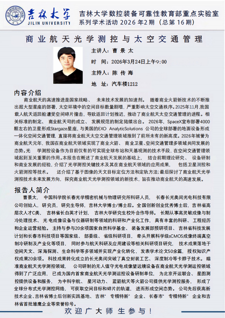 数控装备可靠性教育部重点实验室系列学术活动2026第2期(总第16期)预告|商业航天光学测控与太空交通管理(报告人:曹景太)
